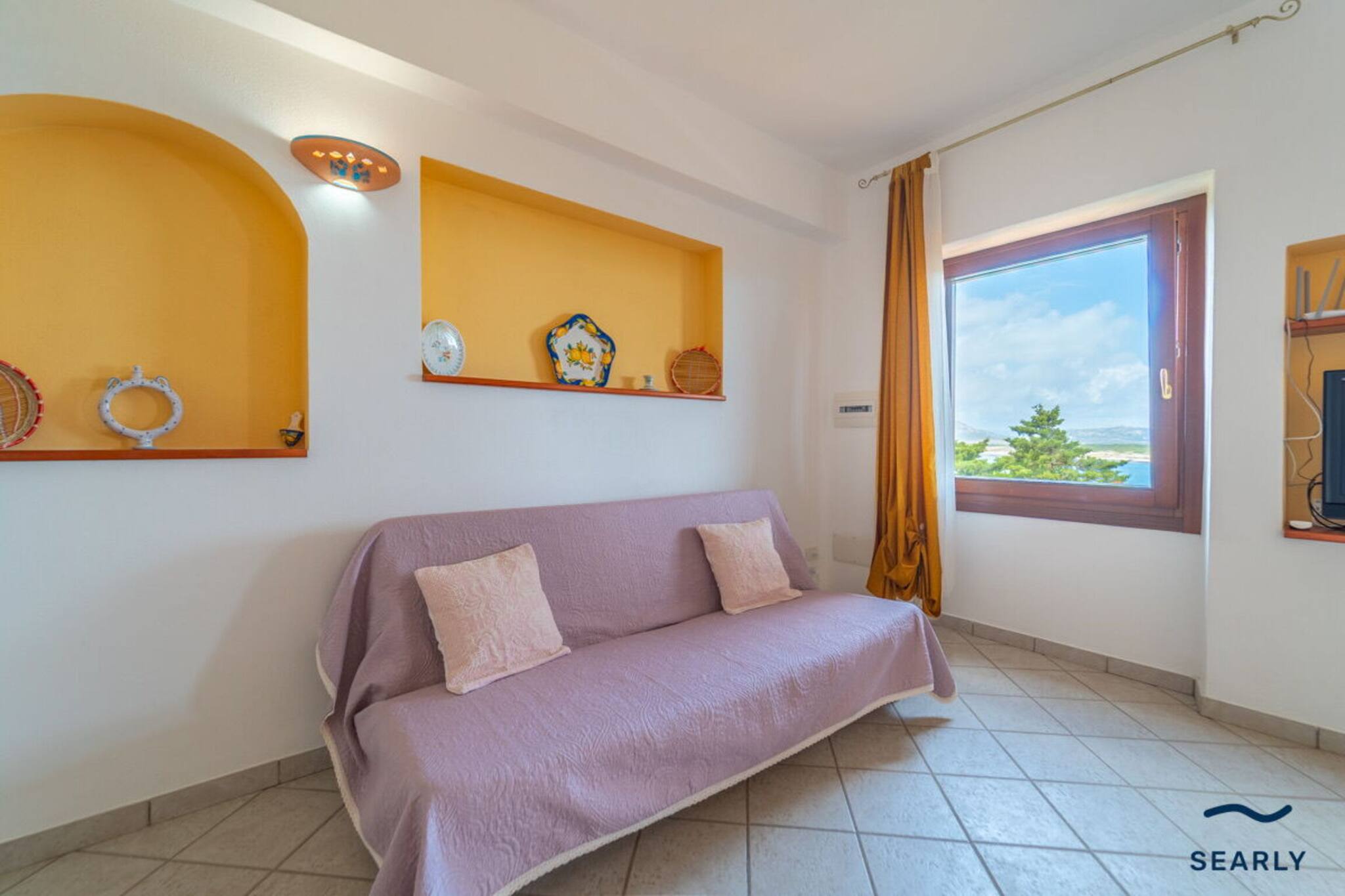 • Sala panoramica con ampia vetrata sul mare e divano letto matrimoniale, perfetta per momenti di relax con vista