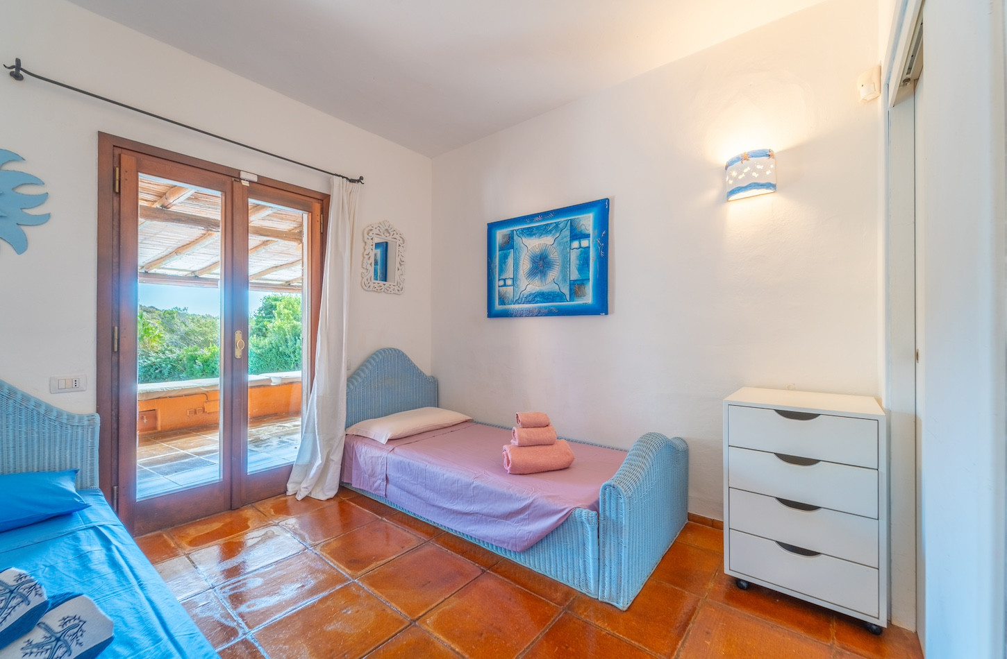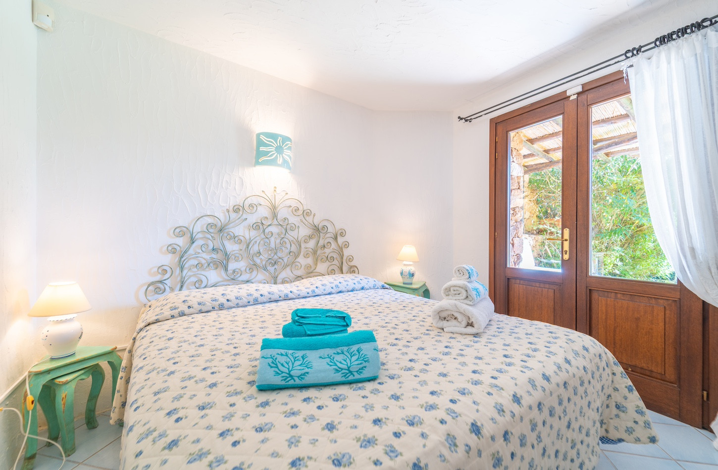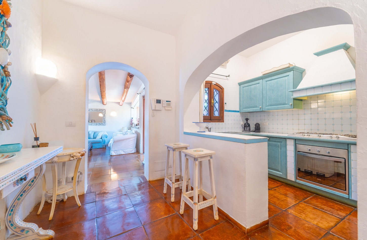 Gli interni sono curati e luminosi, caratterizzati da un’atmosfera calda e raffinata. La cucina indipendente, completamente attrezzata con frigorifero, forno, microonde e caffettiera, permette di vivere la casa in totale autonomia. La zona living si apre verso l’esterno, creando un continuum naturale tra gli ambienti interni e il meraviglioso giardino privato.