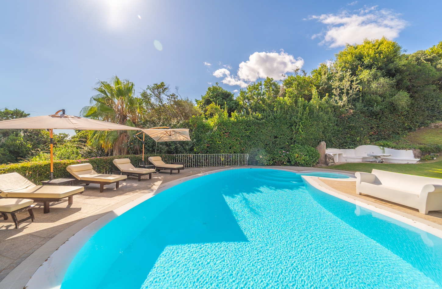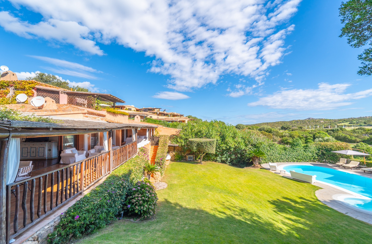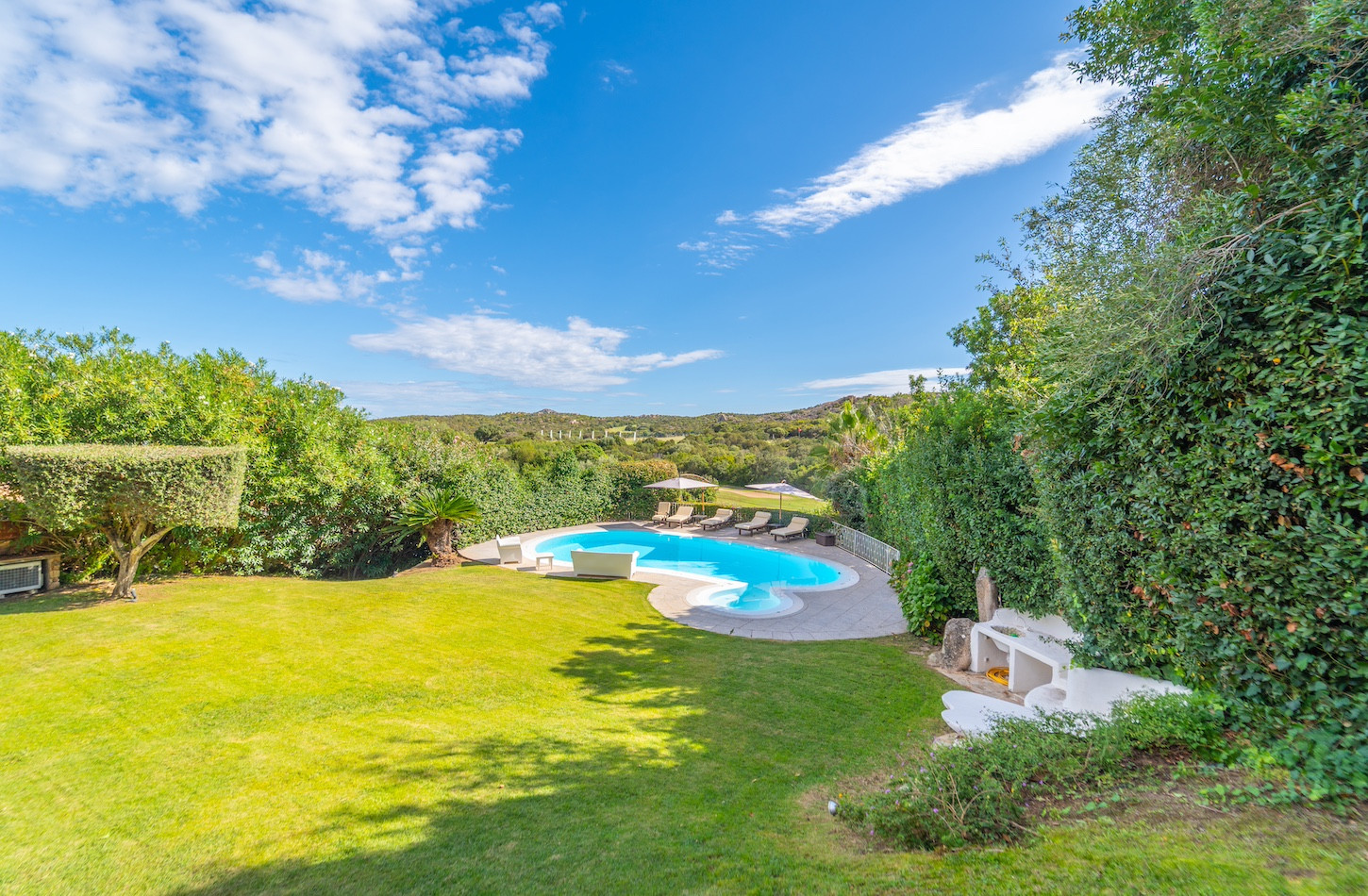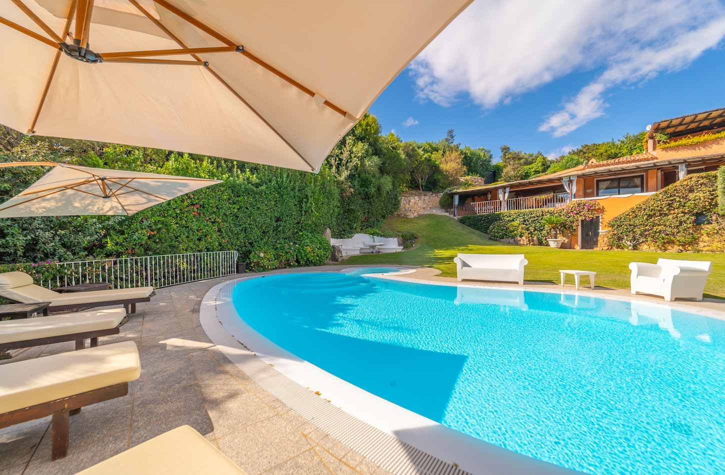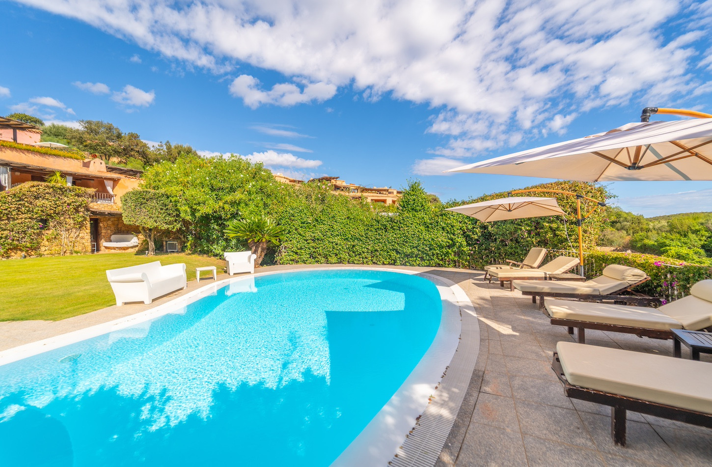 All’esterno, una piscina privata a ossigeno attivo e riscaldata vi accoglie in un’oasi di quiete immersa nel verde, perfetta per lasciarsi andare al relax dopo una giornata tra mare e golf. A completare gli spazi all’aperto, confortevoli zone dedicate al riposo e un comodo parcheggio all’interno della proprietà.