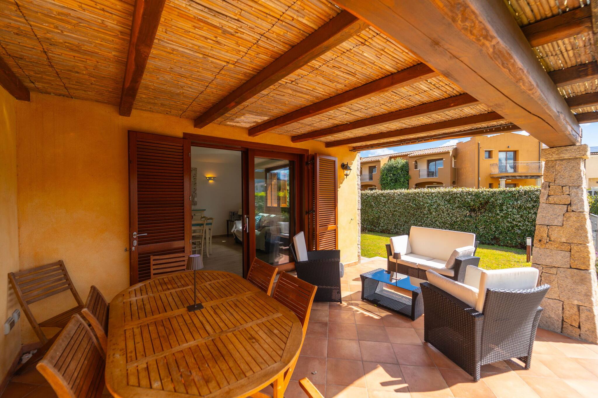 The dwelling is surrounded by a spacious garden maintained on three sides, bordered by a hedge that ensures privacy. Outside, you can enjoy a convenient shower with hot water and a spacious furnished veranda, ideal for moments of relaxation or for outdoor lunches and dinners.