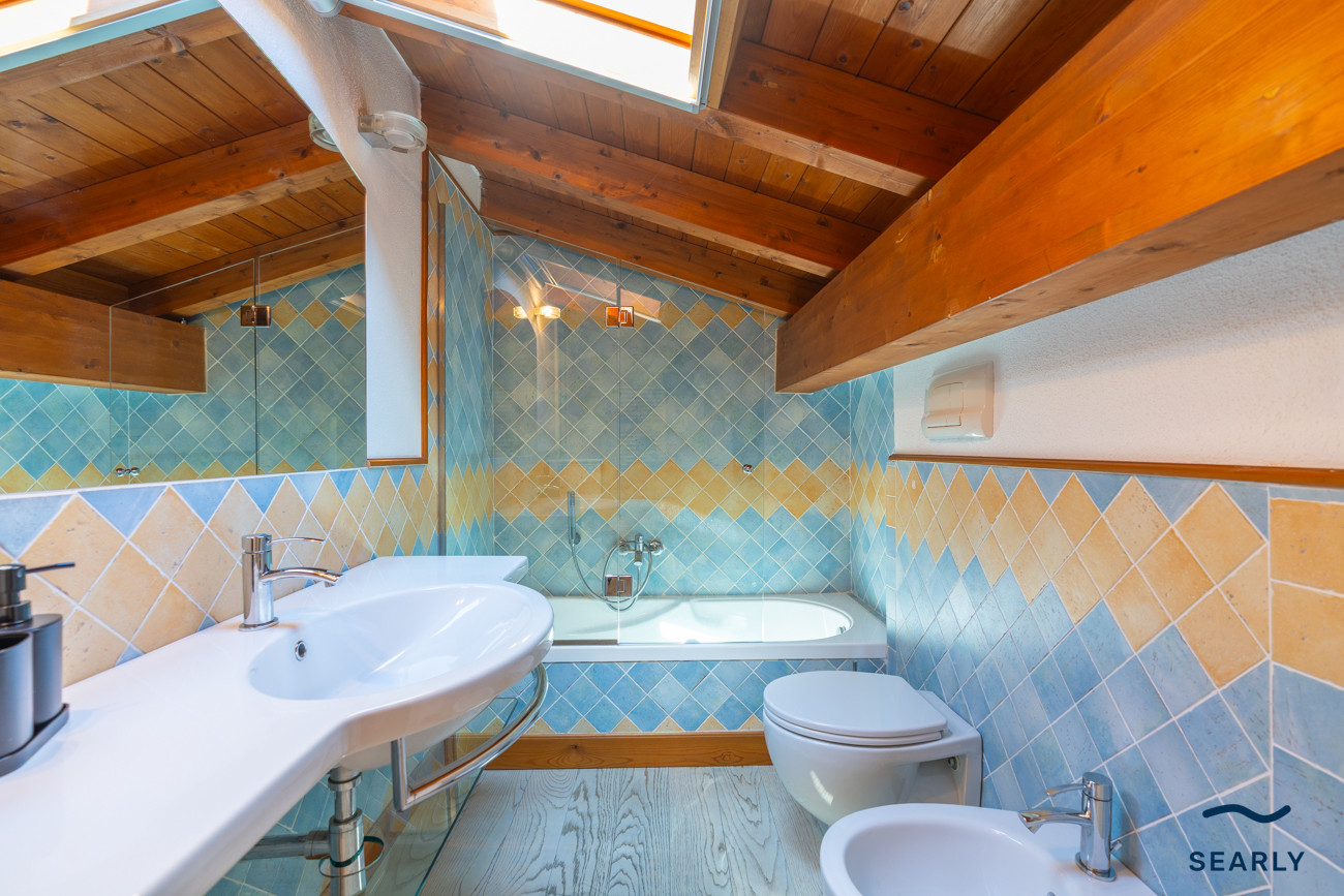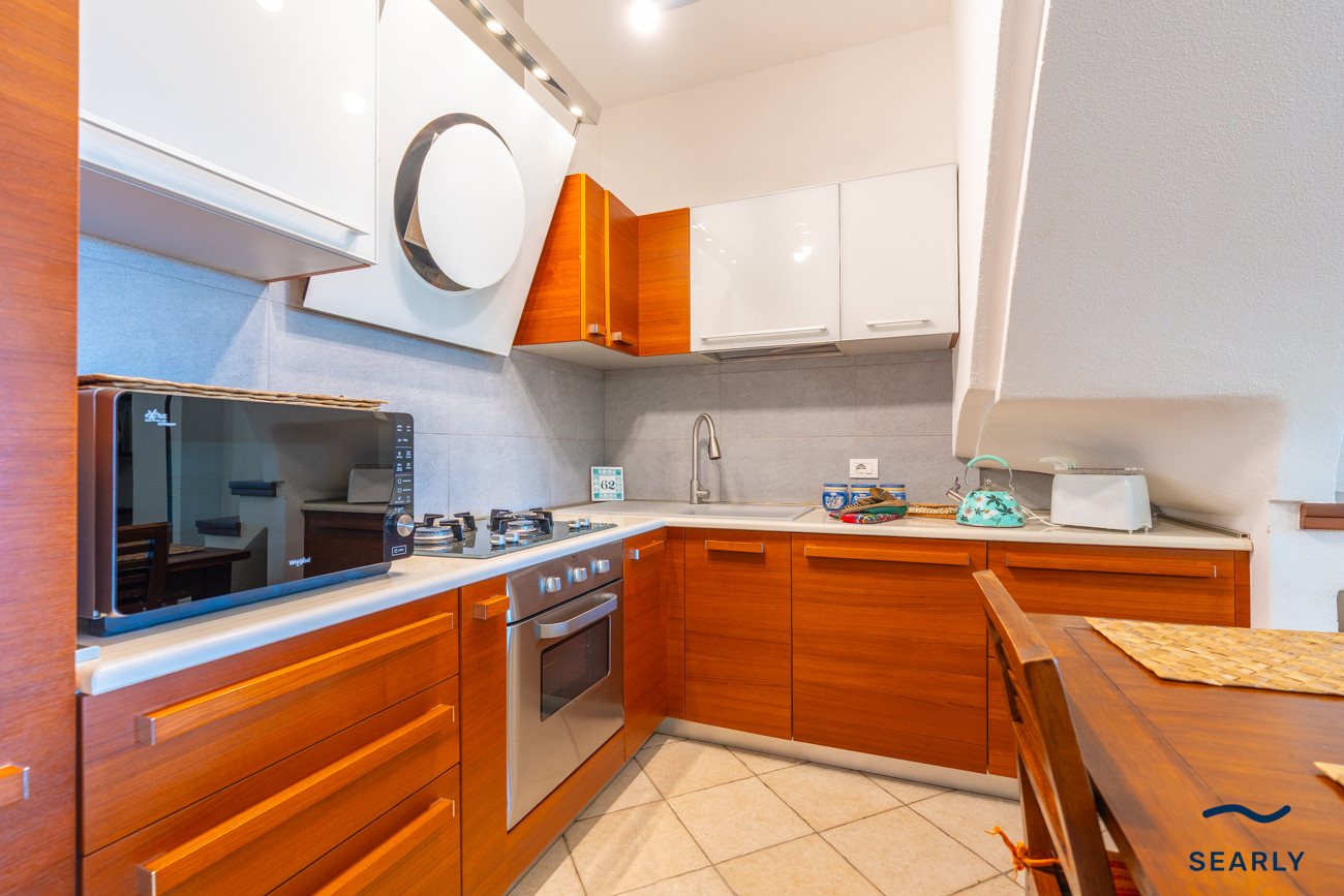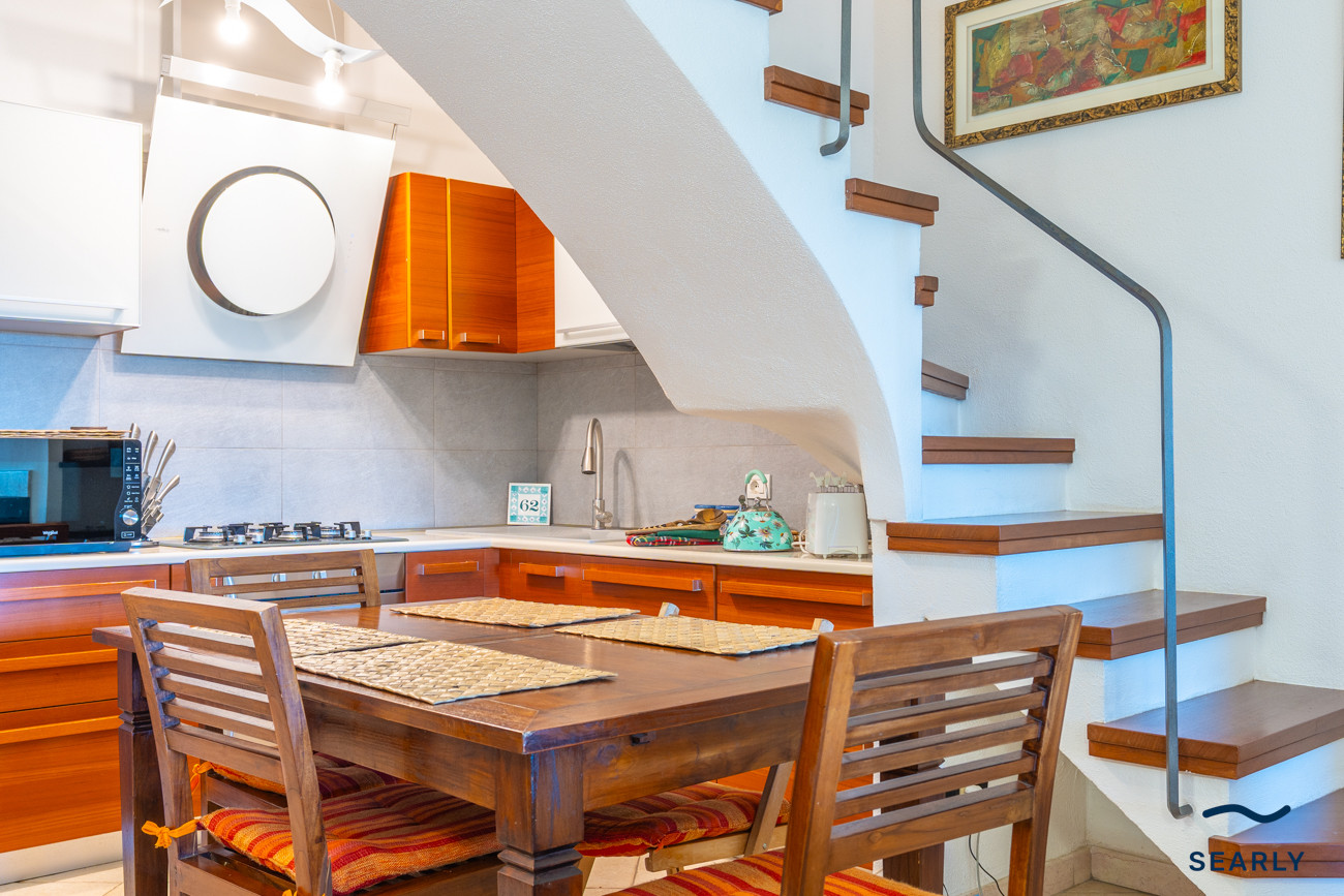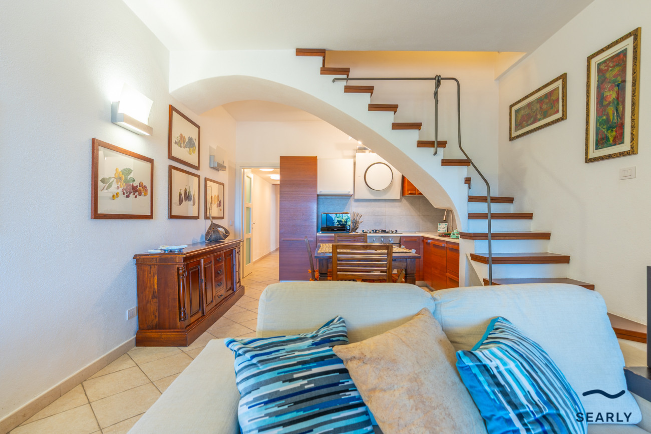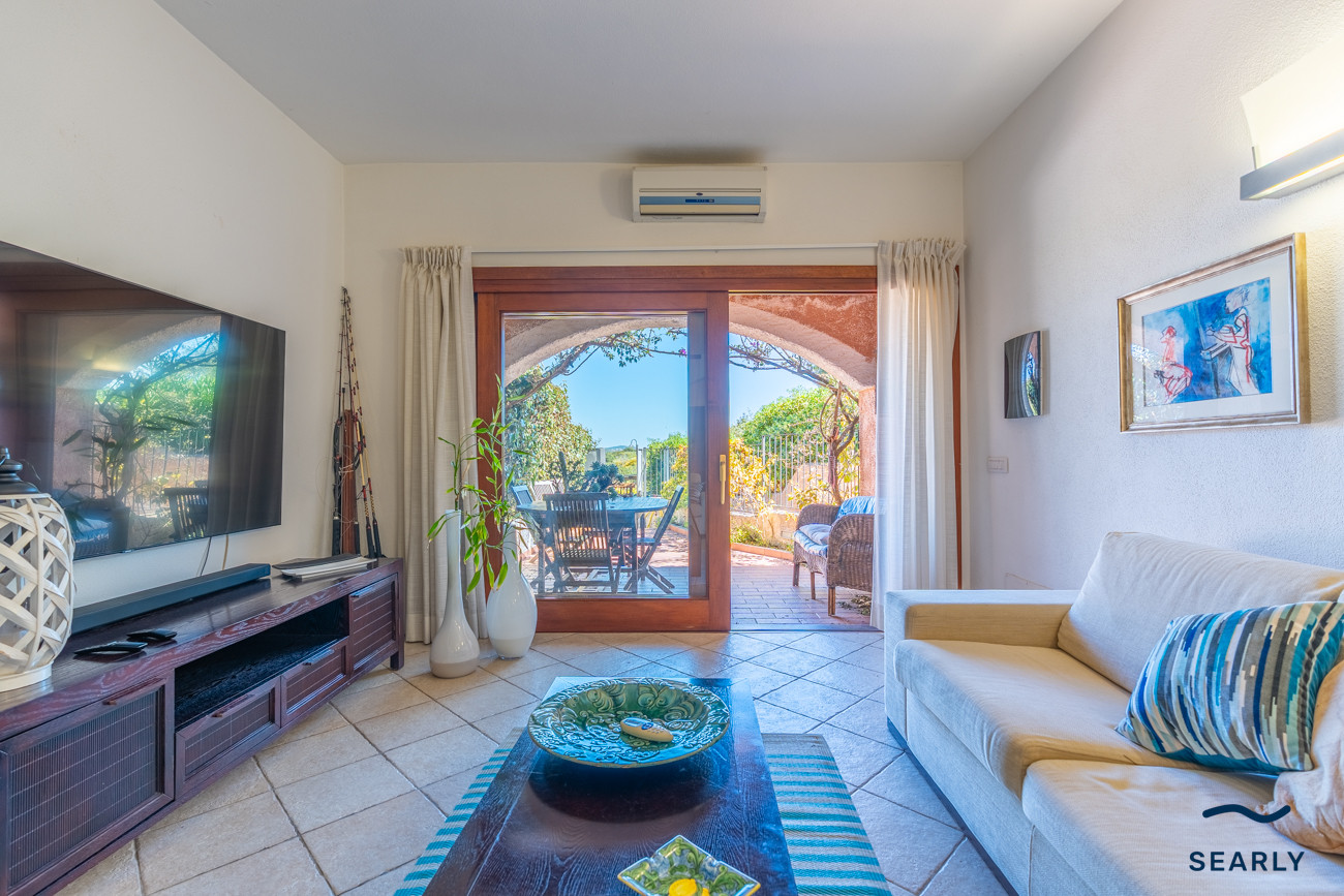 The interior spaces are well-maintained and bright, and its living room, equipped with a comfortable sofa bed for extra space, overlooks the veranda, creating a continuous and airy environment, ideal for enjoying moments of relaxation on summer days.