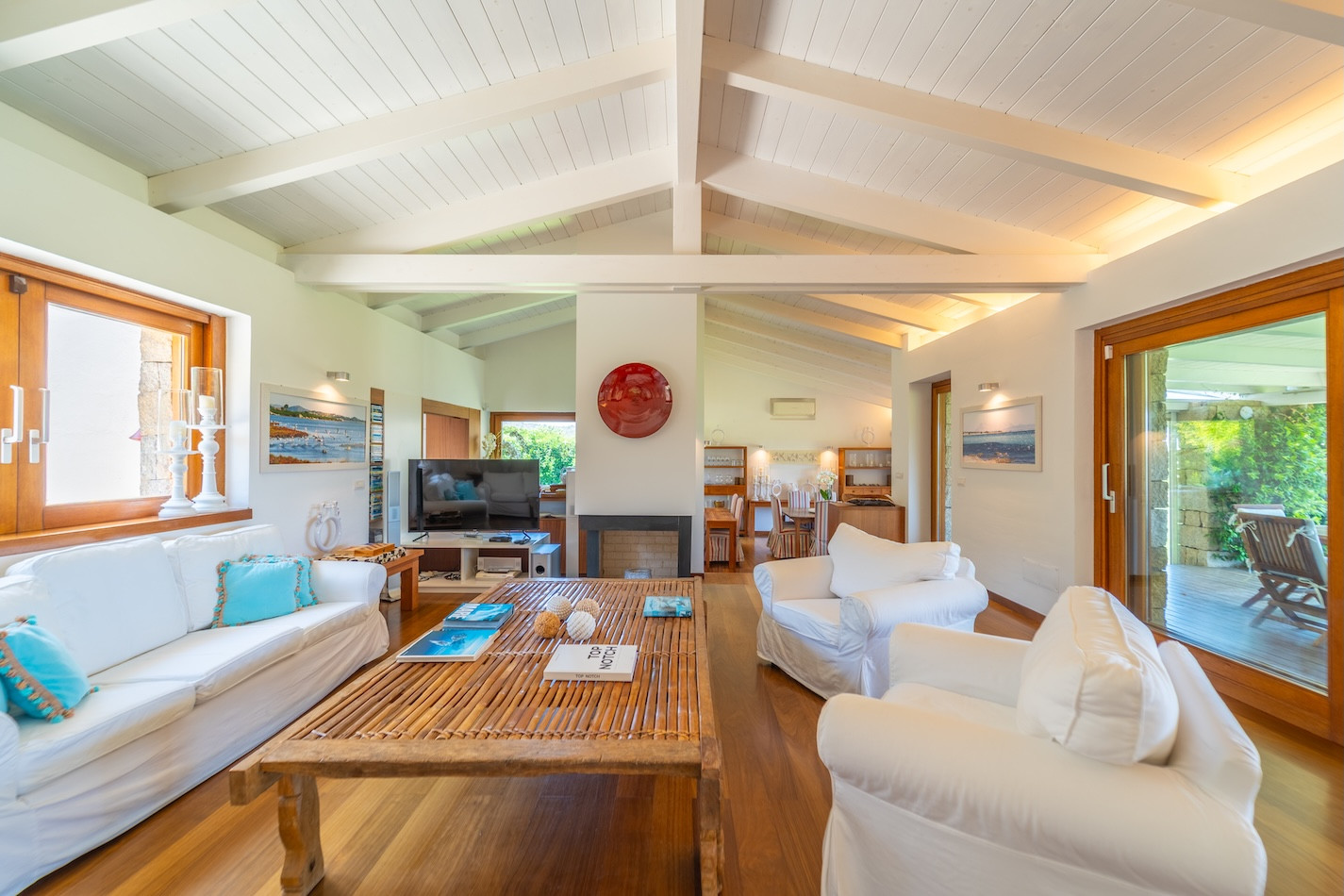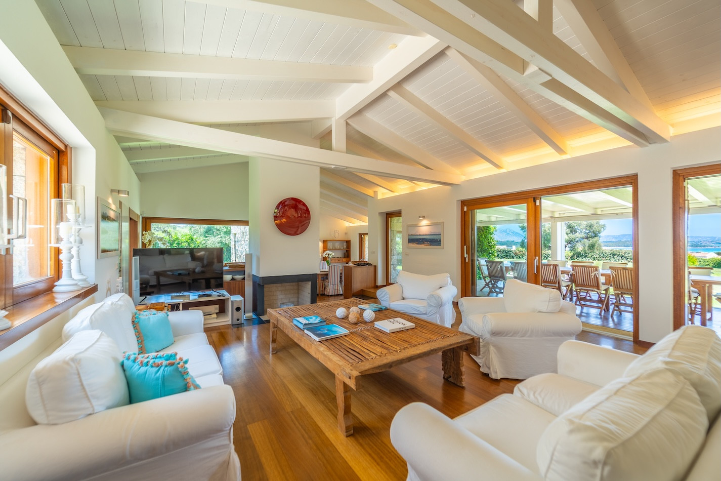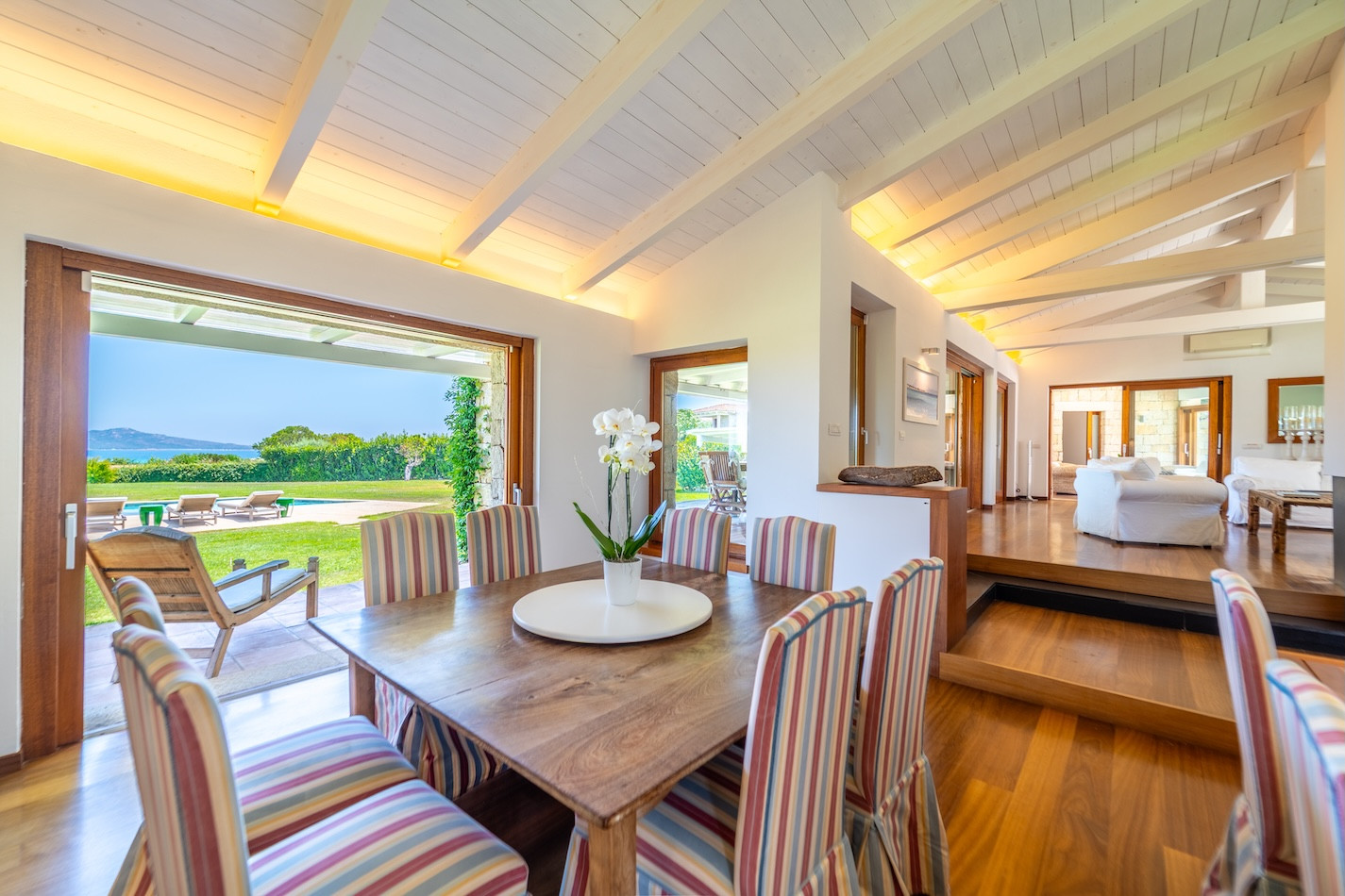 The interiors of the villa are elegant and bright, with a spacious living room equipped with a flat-screen TV, dining area and fully equipped kitchen. The modern style, enhanced by white exposed beams, creates a refined atmosphere with a typical Beach House feel. The villa is fully air-conditioned and offers stunning views of the sea and mountains.
