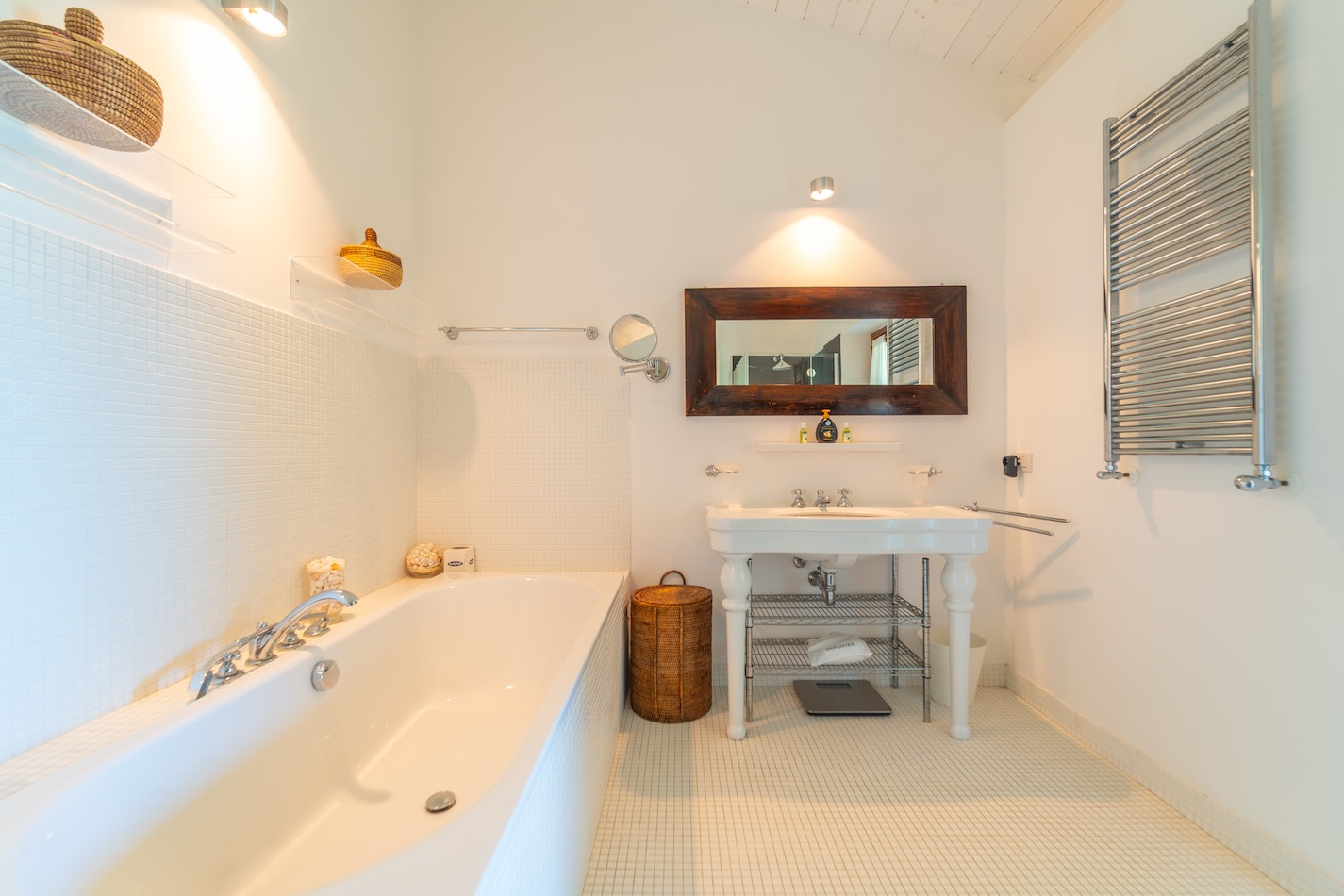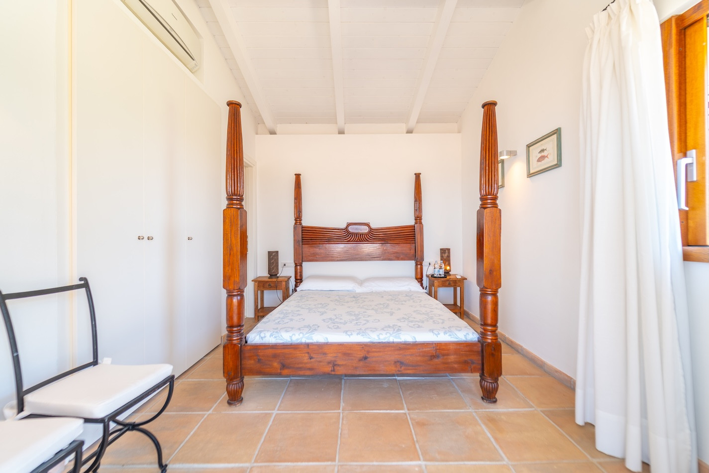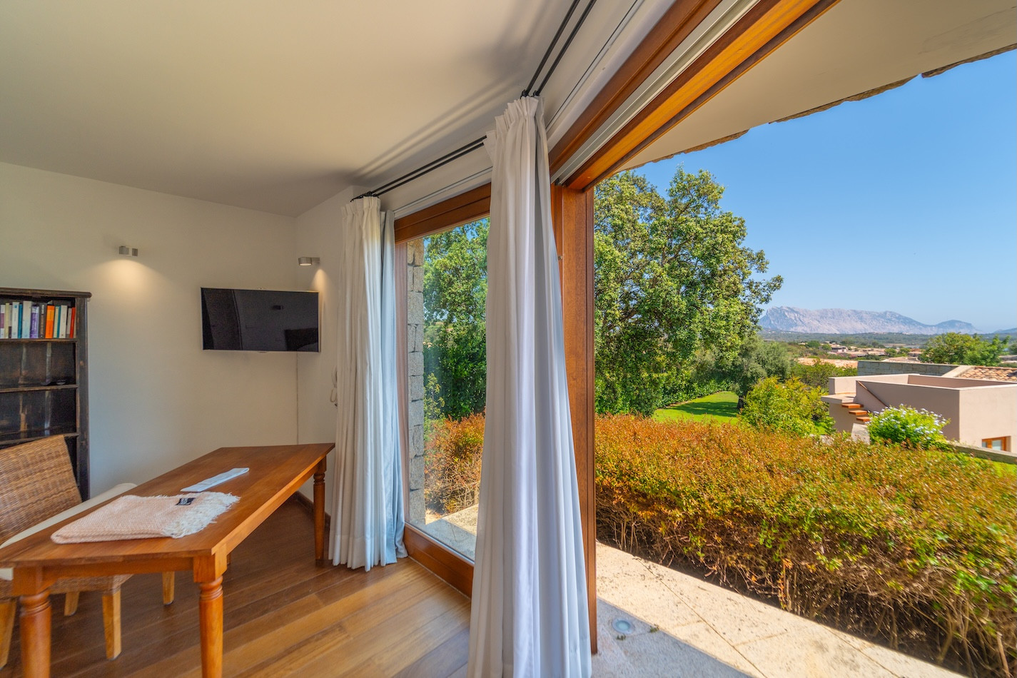 The interiors of the villa are elegant and bright, with a spacious living room equipped with a flat-screen TV, dining area and fully equipped kitchen. The modern style, enhanced by white exposed beams, creates a refined atmosphere with a typical Beach House feel. The villa is fully air-conditioned and offers stunning views of the sea and mountains.
